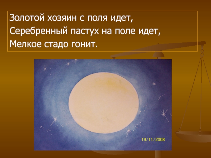 Золотой хозяин с поля идет,Серебренный пастух на поле идет, Мелкое стадо гонит.