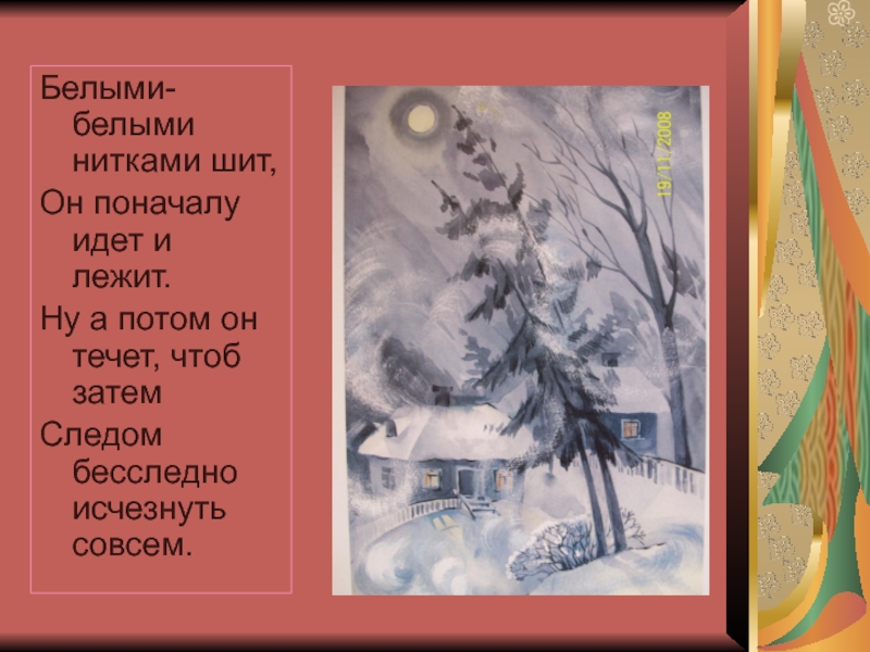 Белыми-белыми нитками шит,Он поначалу идет и лежит. Ну а потом он течет, чтоб затемСледом бесследно исчезнуть совсем.