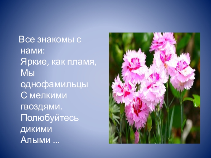 Все знакомы с нами: Яркие, как пламя, Мы однофамильцы С мелкими гвоздями. Полюбуйтесь дикими Алыми