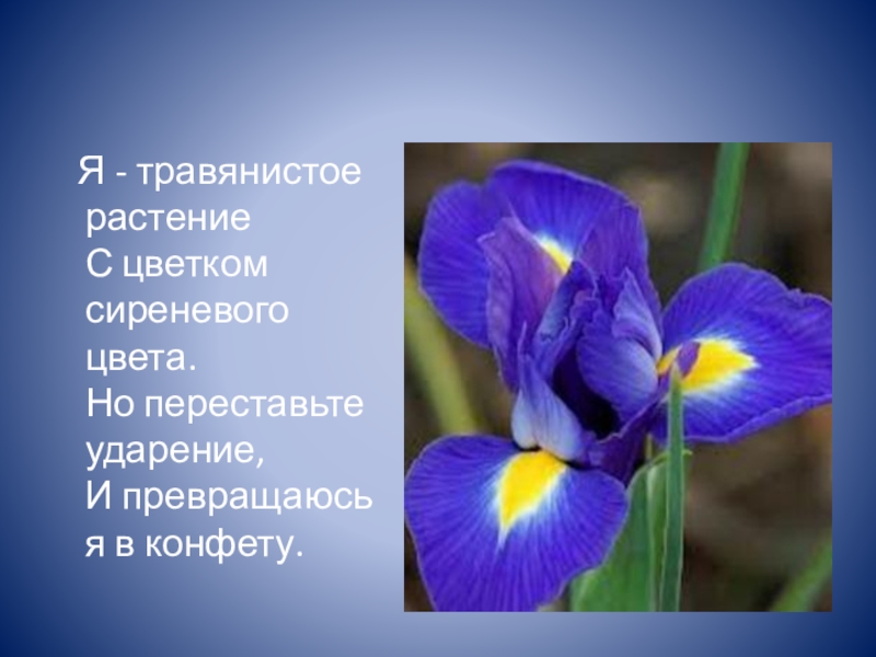 Слайд 22 Я - травянистое растение  С цветком сиреневого цвета.  Но переставьте ударение,  И