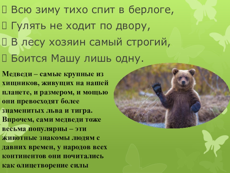 Медведи – самые крупные из хищников, живущих на нашей планете, и размером, и мощью они превосходят более знаменитых льва и тигра. Впрочем, сами медведи тоже весьма популярны – эти животные знакомы людям с давних времен, у народов всех континентов они почитались как олицетворение силы
