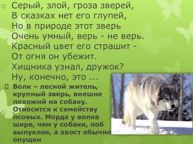 Волк – лесной житель, крупный зверь, внешне похожий на собаку. Относится к семейству псовых. Морда у волка шире, чем у собаки, лоб выпуклее, а хвост обычно опущен