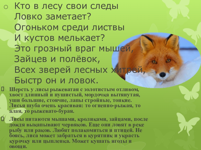 Шерсть у лисы рыжеватая с золотистым отливом, хвост длинный и пушистый, мордочка вытянутая, уши большие, стоячие, лапы стройные, тонкие. Лисья шуба очень красивая: то огненно-рыжая, то алая, то рыжевато-бурая.