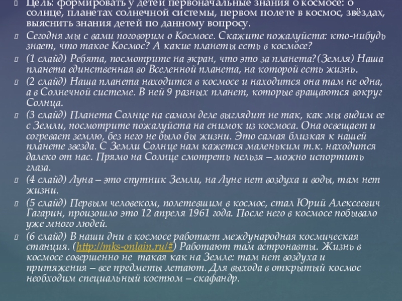 Цель: формировать у детей первоначальные знания о космосе: о солнце, планетах солнечной системы, первом полете в космос,