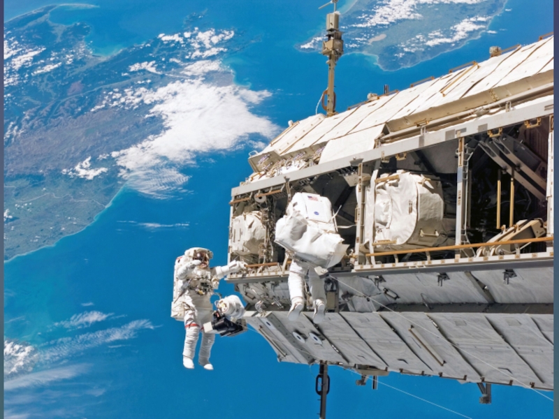 (6 слайд) В наши дни в космосе работает международная космическая станция. (http://mks-onlain.ru/#) Работают там астронавты. Жизнь в космосе совершенно не такая как на Земле: там нет воздуха и притяжения – все предметы летают. Для выхода в открытый космос необходим специальный костюм – скафандр.