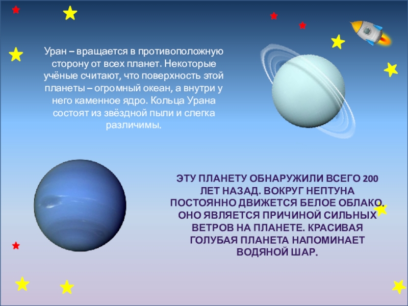 Эту планету обнаружили всего 200 лет назад. Вокруг Нептуна постоянно движется белое облако. Оно является причиной сильных ветров на планете. Красивая голубая планета напоминает водяной шар.