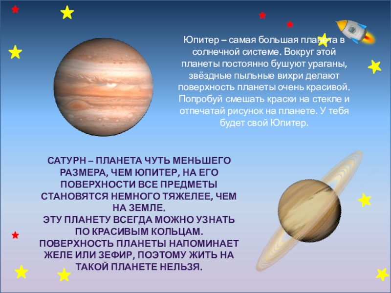 Эту планету всегда можно узнать по красивым кольцам. Поверхность планеты напоминает желе или зефир, поэтому жить на такой планете нельзя.