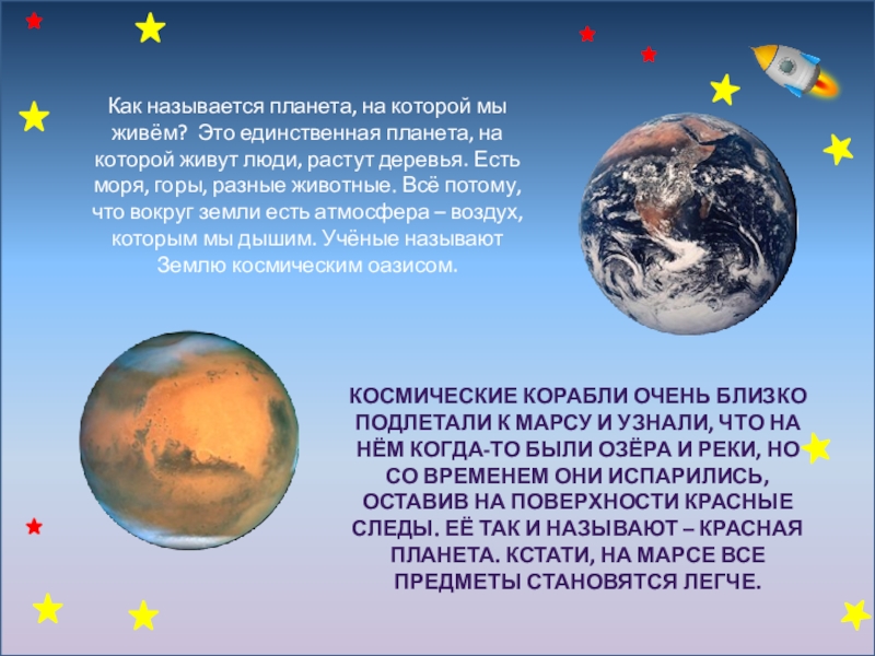 Космические корабли очень близко подлетали к Марсу и узнали, что на нём когда-то были озёра и реки, но со временем они испарились, оставив на поверхности красные следы. Её так и называют – Красная планета. Кстати, на Марсе все предметы становятся легче.