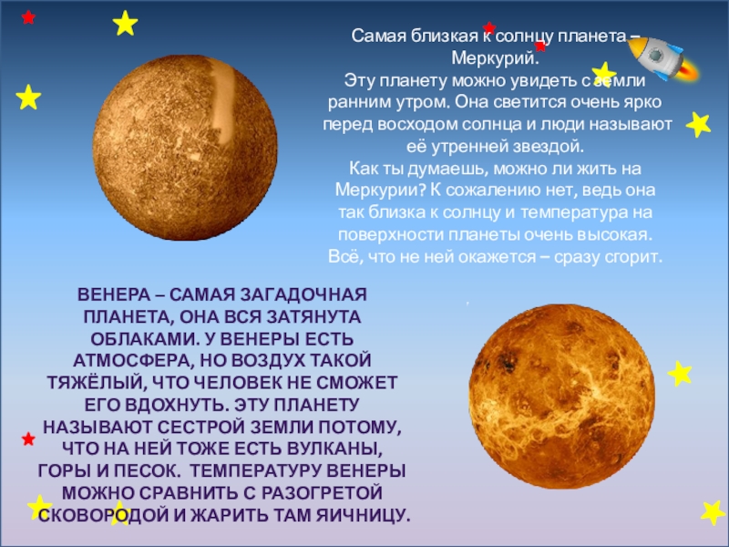 Венера – самая загадочная планета, она вся затянута облаками. У Венеры есть атмосфера, но воздух такой тяжёлый, что человек не сможет его вдохнуть. Эту планету называют сестрой Земли потому, что на ней тоже есть вулканы, горы и песок. Температуру Венеры можно сравнить с разогретой сковородой и жарить там яичницу.