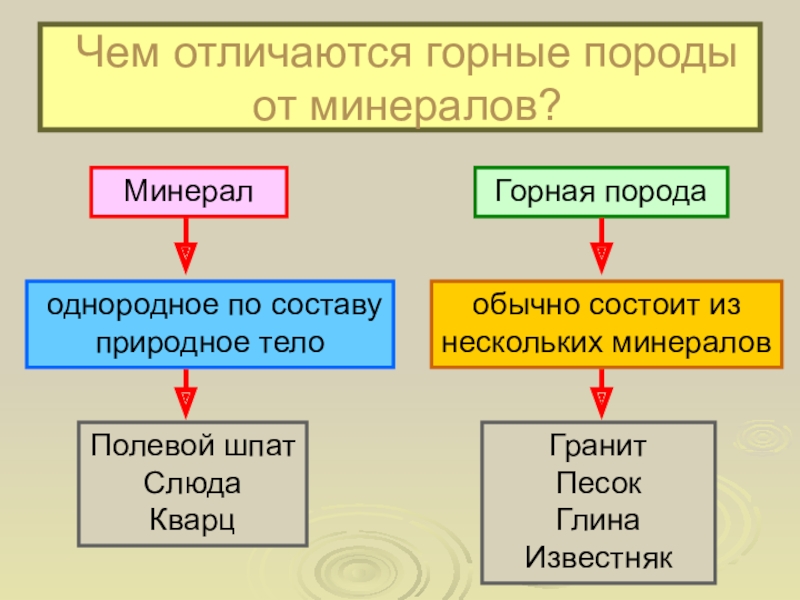 Чем отличаются горные породы от минералов? однородное по составуприродное телоПолевой шпатСлюдаКварцГорная порода Минерал обычно состоит из нескольких