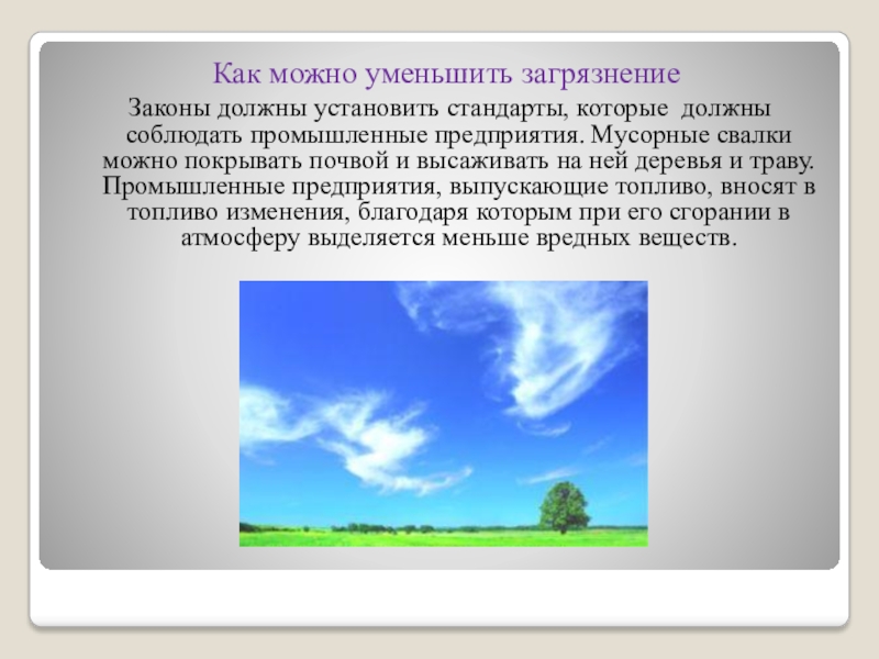 Как можно уменьшить загрязнение Законы должны установить стандарты, которые должны соблюдать промышленные предприятия. Мусорные свалки можно покрывать