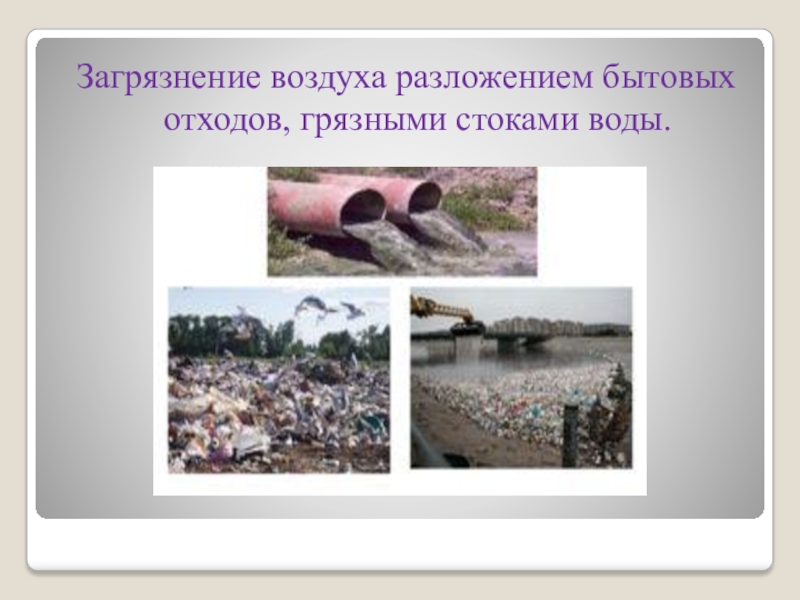 Слайд 7Загрязнение воздуха разложением бытовых отходов, грязными стоками воды.