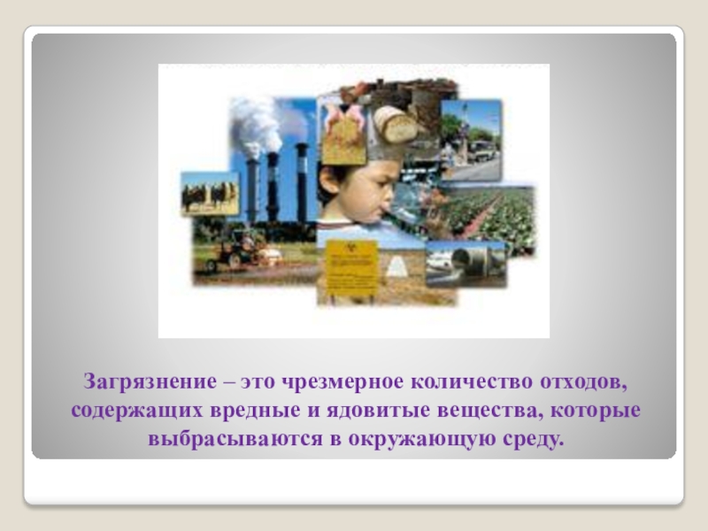 Слайд 2Загрязнение – это чрезмерное количество отходов, содержащих вредные и ядовитые вещества,