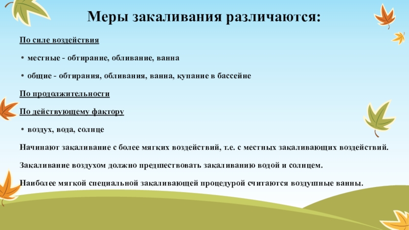 Закаливание воздухом должно предшествовать закаливанию водой и солнцем.