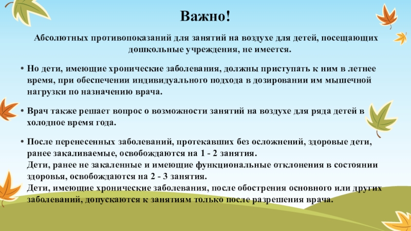 Но дети, имеющие хронические заболевания, должны приступать к ним в летнее время, при обеспечении индивидуального подхода в дозировании им мышечной нагрузки по назначению врача.