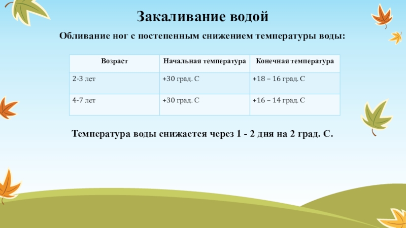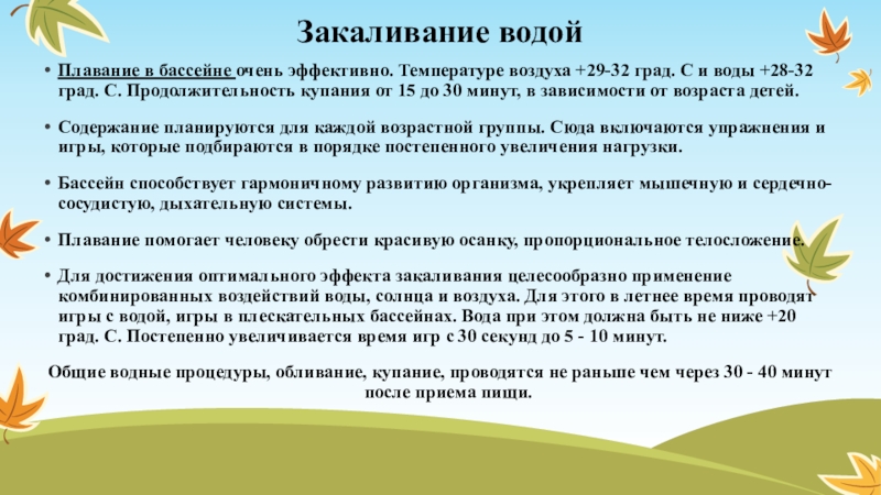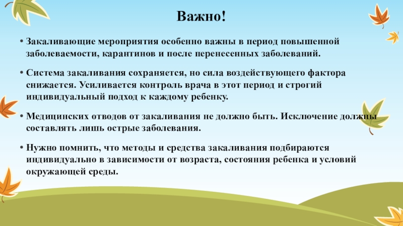 Система закаливания сохраняется, но сила воздействующего фактора снижается. Усиливается контроль врача в этот период и строгий индивидуальный подход к каждому ребенку.