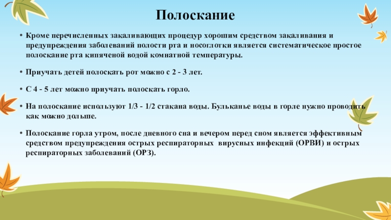 Кроме перечисленных закаливающих процедур хорошим средством закаливания и предупреждения заболеваний полости