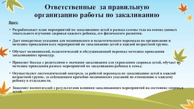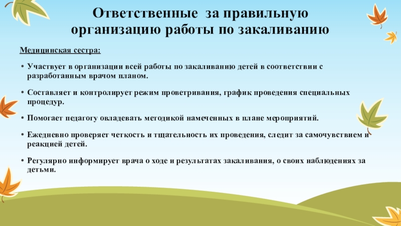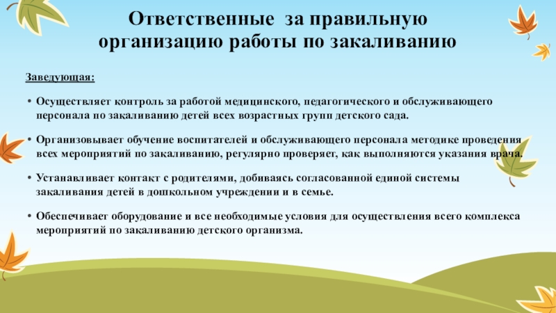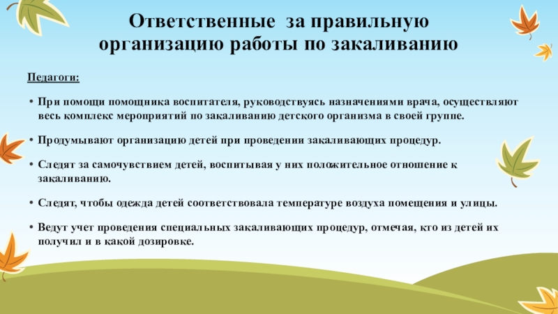 Слайд 24Ответственные за правильную организацию работы по закаливанию