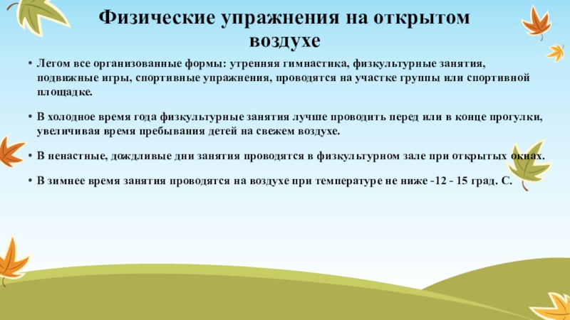 В холодное время года физкультурные занятия лучше проводить перед или в конце прогулки, увеличивая время пребывания детей на свежем воздухе.