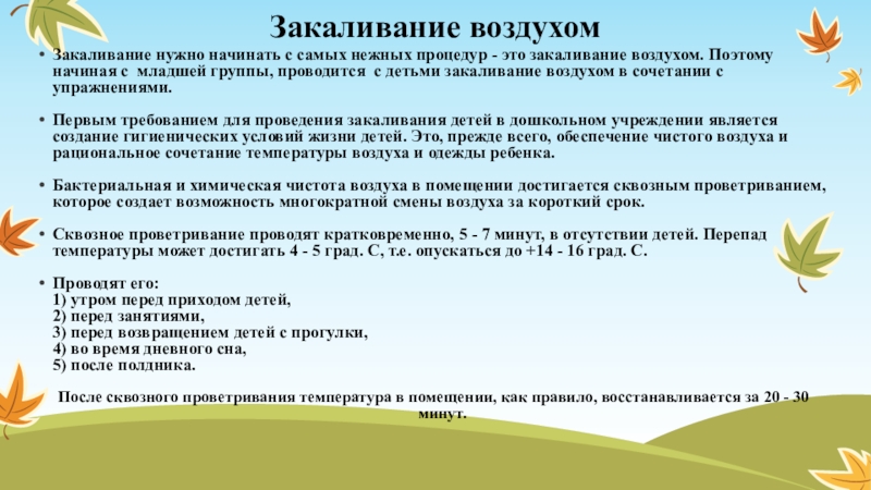 Первым требованием для проведения закаливания детей в дошкольном учреждении является создание гигиенических условий жизни детей. Это, прежде всего, обеспечение чистого воздуха и рациональное сочетание температуры воздуха и одежды ребенка.
