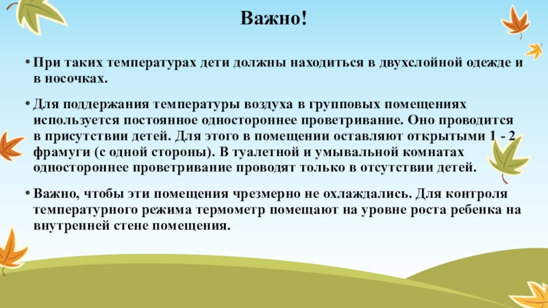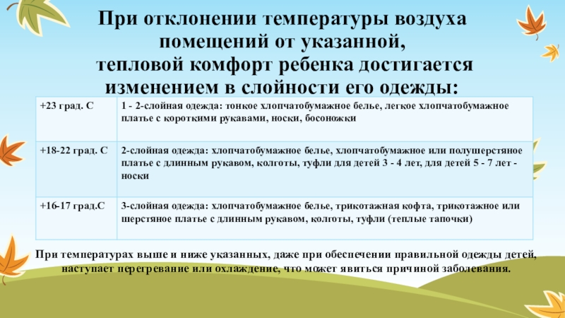 При температурах выше и ниже указанных, даже при обеспечении правильной одежды детей, наступает перегревание или охлаждение, что может явиться причиной заболевания.