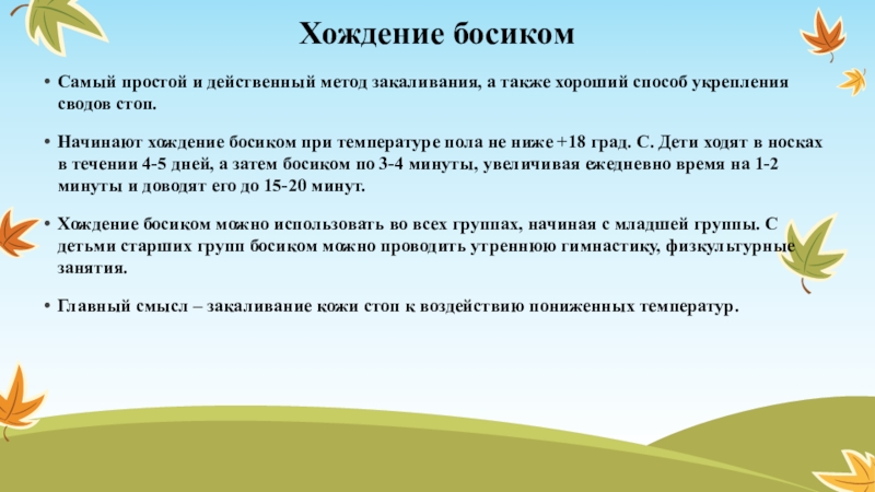 Начинают хождение босиком при температуре пола не ниже +18 град. С. Дети ходят в носках в течении 4-5 дней, а затем босиком по 3-4 минуты, увеличивая ежедневно время на 1-2 минуты и доводят его до 15-20 минут.