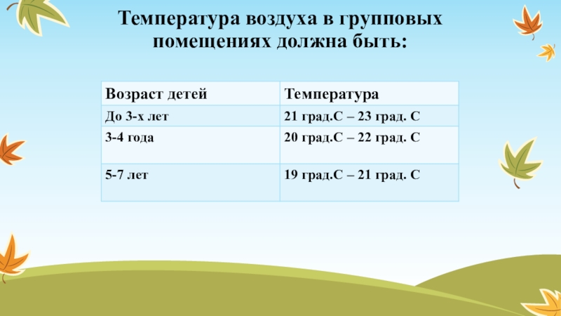 Слайд 8Температура воздуха в групповых помещениях должна быть: