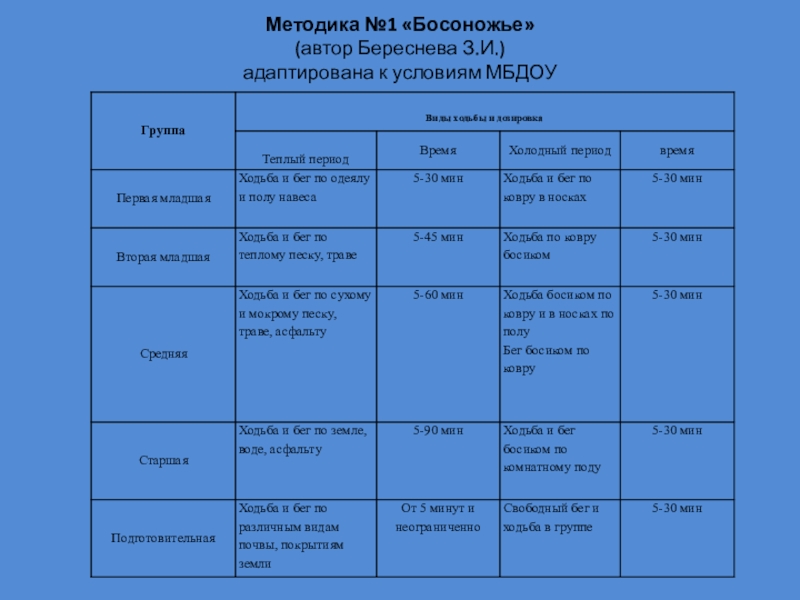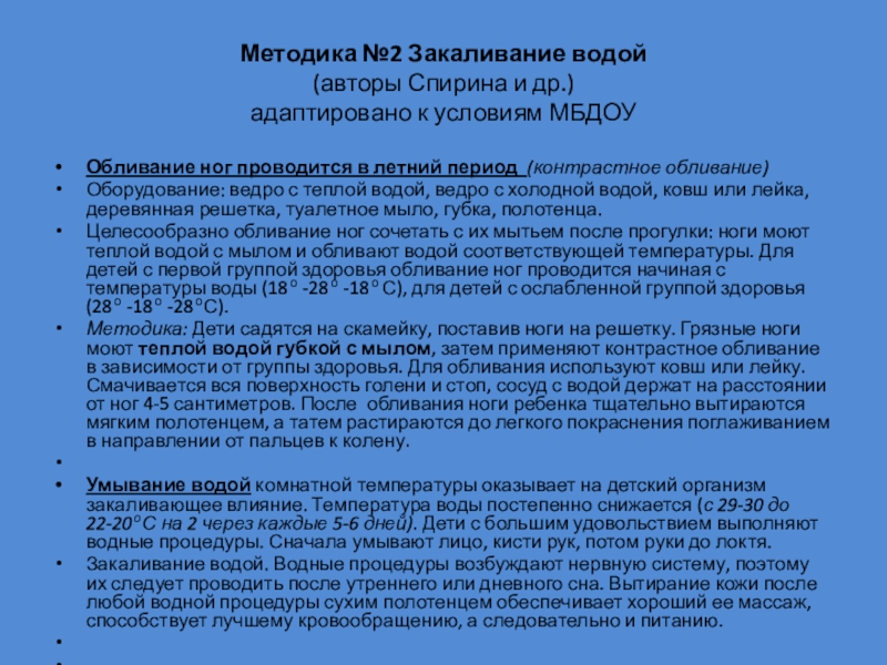 Методика: Дети садятся на скамейку, поставив ноги на решетку. Грязные ноги моют теплой водой губкой с мылом, затем применяют контрастное обливание в зависимости от группы здоровья. Для обливания используют ковш или лейку. Смачивается вся поверхность голени и стоп, сосуд с водой держат на расстоянии от ног 4-5 сантиметров. После обливания ноги ребенка тщательно вытираются мягким полотенцем, а татем растираются до легкого покраснения поглаживанием в направлении от пальцев к колену.