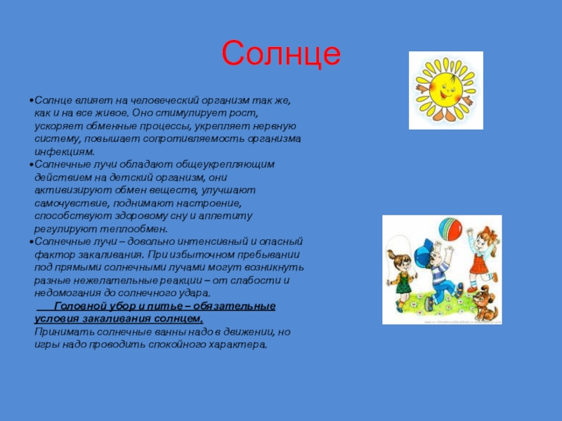 Солнечные лучи обладают общеукрепляющим действием на детский организм, они активизируют обмен веществ, улучшают самочувствие, поднимают настроение, способствуют здоровому сну и аппетиту регулируют теплообмен.