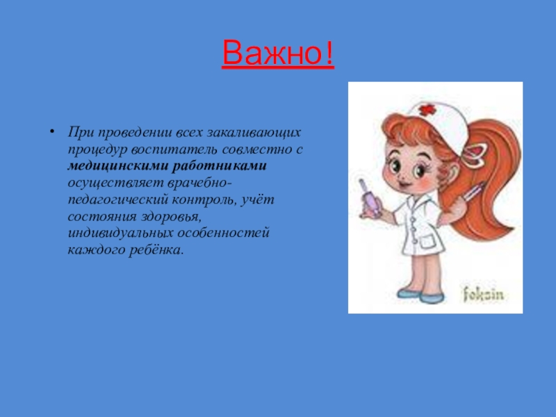 При проведении всех закаливающих процедур воспитатель совместно с медицинскими работниками осуществляет