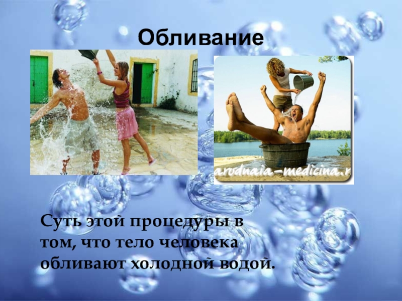 ОбливаниеСуть этой процедуры в том, что тело человека обливают холодной водой.