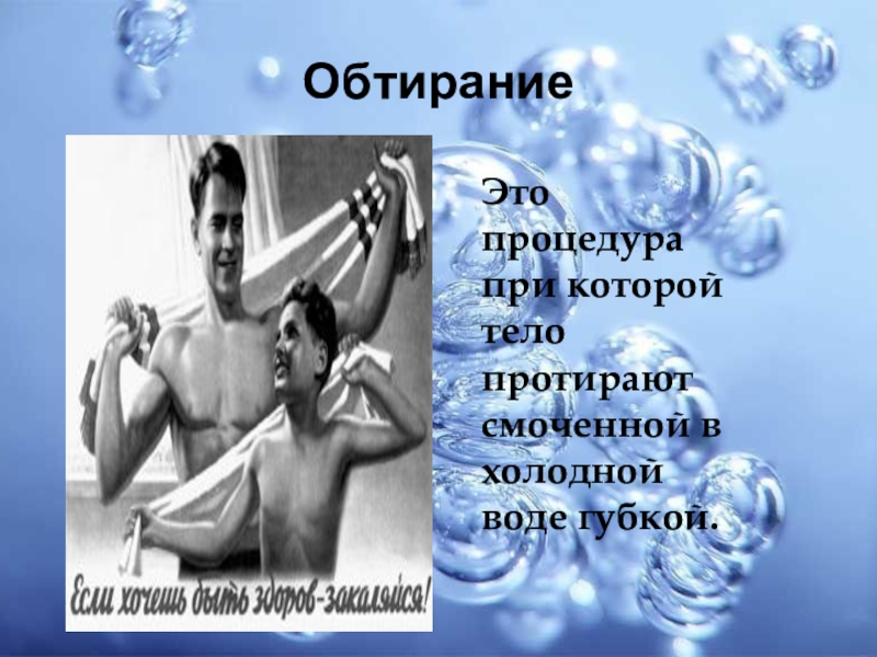 ОбтираниеЭто процедура при которой тело протирают смоченной в холодной воде губкой.