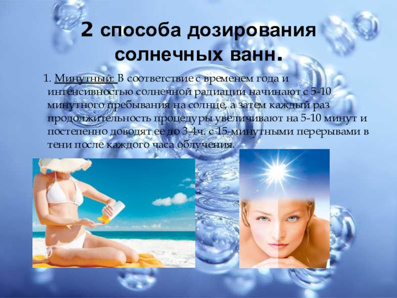 2 способа дозирования солнечных ванн.	1. Минутный: В соответствие с временем года и интенсивностью солнечной радиации начинают с
