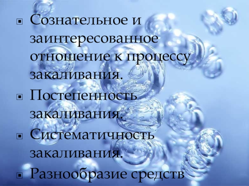 Сознательное и заинтересованное отношение к процессу закаливания. Постепенность закаливания. Систематичность закаливания. Разнообразие средств закаливания.