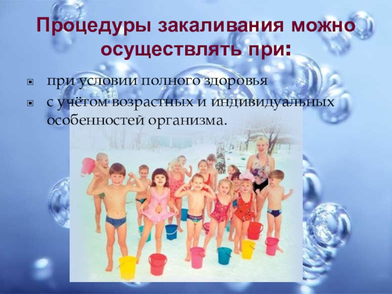 Процедуры закаливания можно осуществлять при:при условии полного здоровьяс учётом возрастных и индивидуальных особенностей организма.