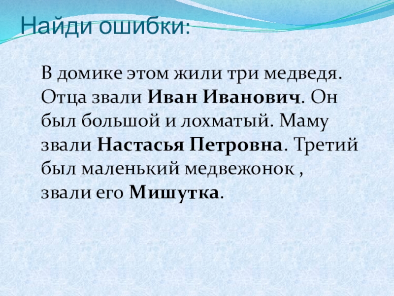 был большой и лохматый. Маму звали Настасья Петровна. Третий был маленький медвежонок , звали его Мишутка.