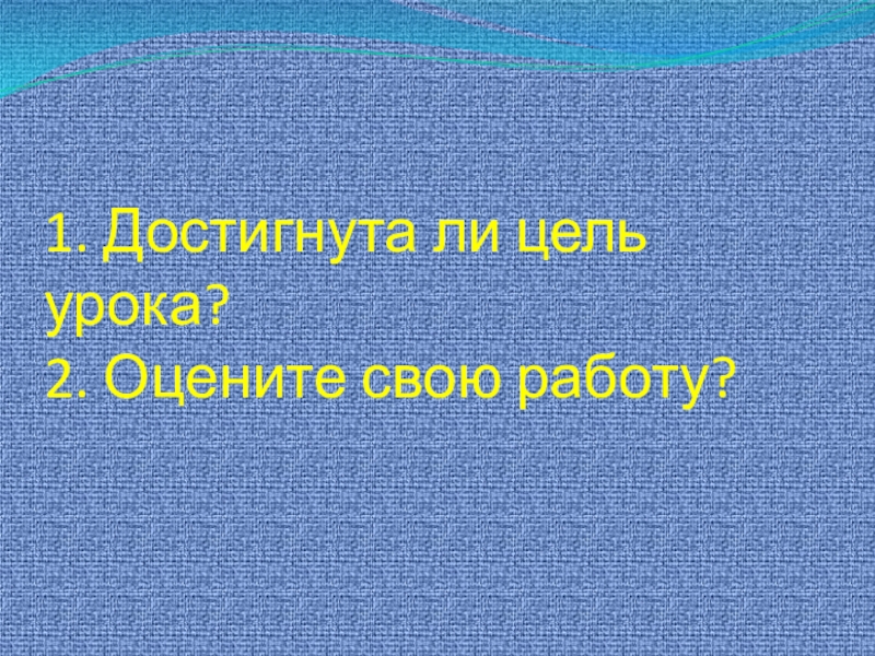 Слайд 131. Достигнута ли цель урока? 2. Оцените свою работу?