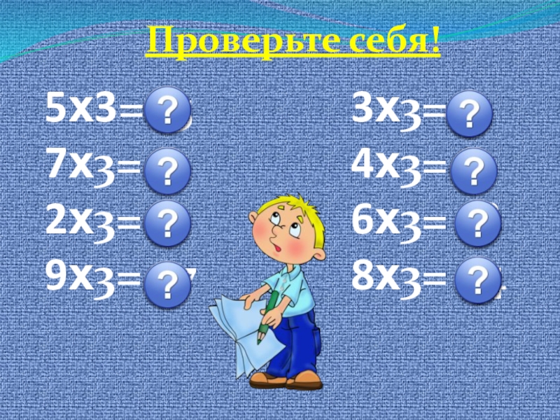 5х3= 157х3= 212х3= 69х3= 273х3= 94х3= 126х3= 188х3= 24Проверьте себя!