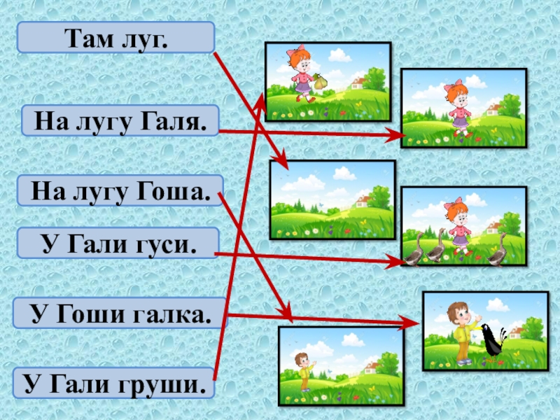 Там луг.На лугу Галя.На лугу Гоша.У Гали гуси.У Гоши галка.У Гали груши.