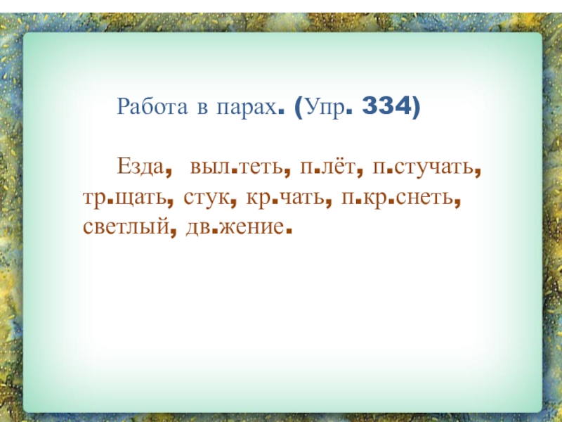 Слайд 6 Работа в парах. (Упр. 334) Езда, выл.теть,
