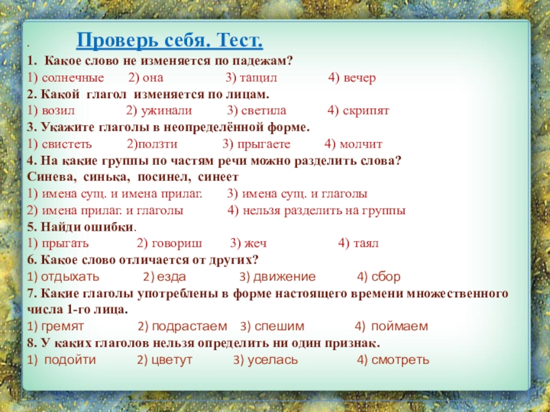 изменяется по падежам? 1) солнечные 2) она 3) тащил 4) вечер 2. Какой глагол изменяется по лицам. 1) возил 2) ужинали 3) светила 4) скрипят 3. Укажите глаголы в неопределённой форме. 1) свистеть 2)ползти 3) прыгаете 4) молчит 4. На какие группы по частям речи можно разделить слова? Синева, синька, посинел, синеет 1) имена сущ. и имена прилаг. 3) имена сущ. и глаголы 2) имена прилаг. и глаголы 4) нельзя разделить на группы 5. Найди ошибки. 1) прыгать 2) говориш 3) жеч 4) таял 6. Какое слово отличается от других? 1) отдыхать 2) езда 3) движение 4) сбор 7. Какие глаголы употреблены в форме настоящего времени множественного числа 1-го лица. 1) гремят 2) подрастаем 3) спешим 4) поймаем 8. У каких глаголов нельзя определить ни один признак. 1) подойти 2) цветут 3) уселась 4) смотреть