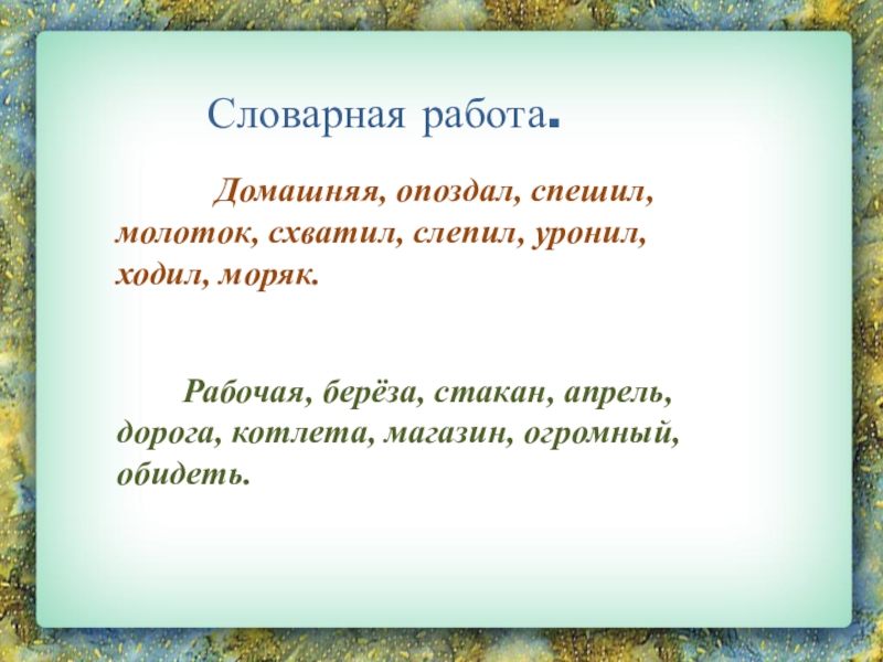 Словарная работа. Домашняя, опоздал, рабочая, берёза, спешил, молоток, стакан, апрель, схватил, слепил, дорога, уронил, котлета, магазин, ходил, моряк, огромный, обидеть.