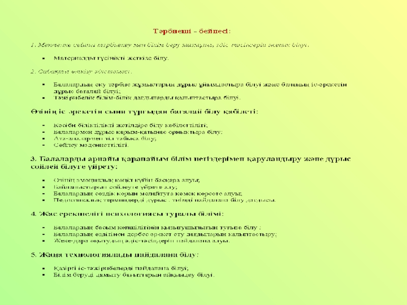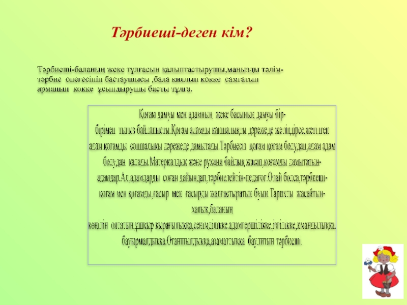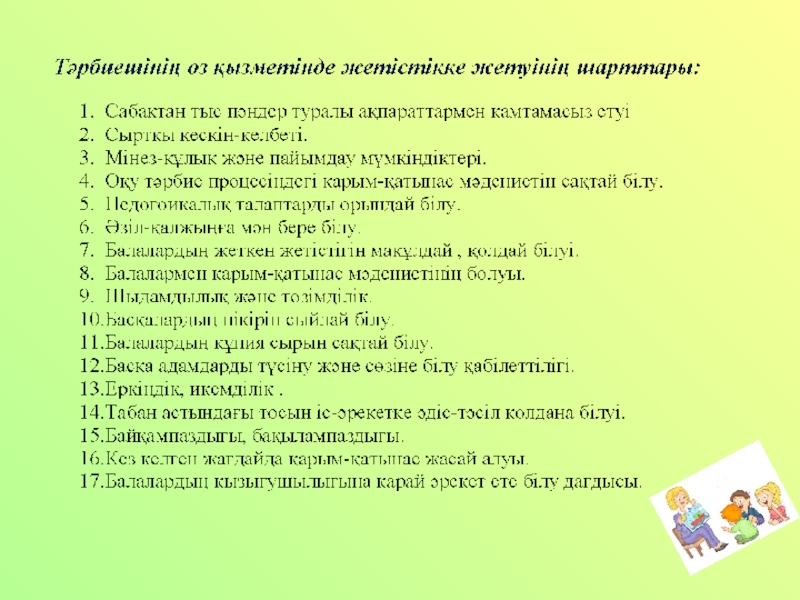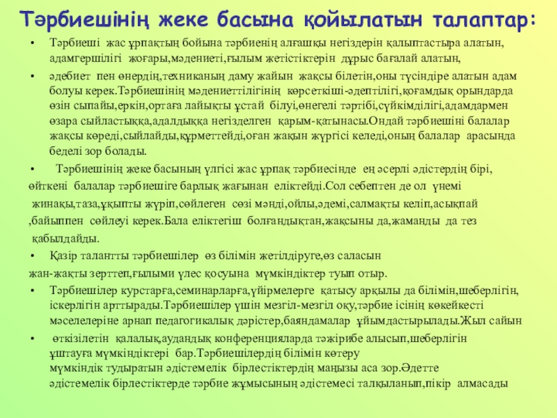 Слайд 13Тәрбиешінің жеке басына қойылатын талаптар: