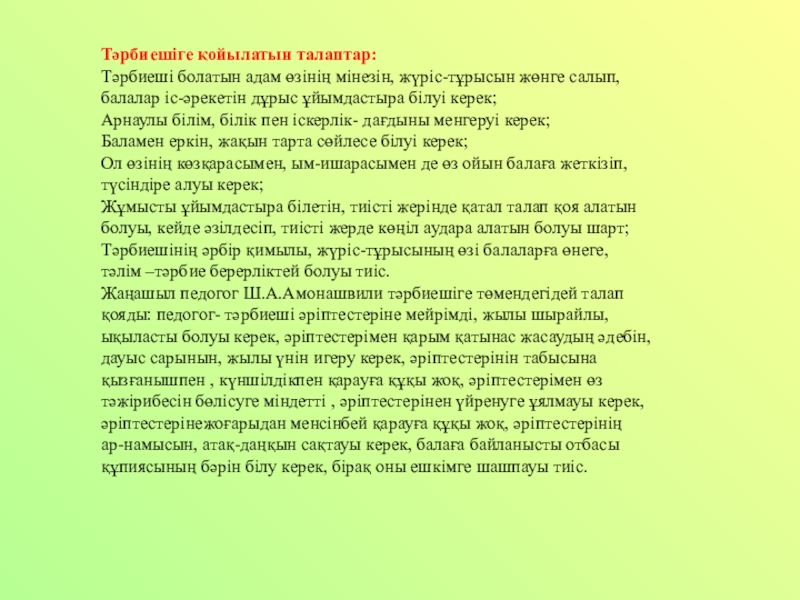Слайд 12Тәрбиешіге қойылатын талаптар: