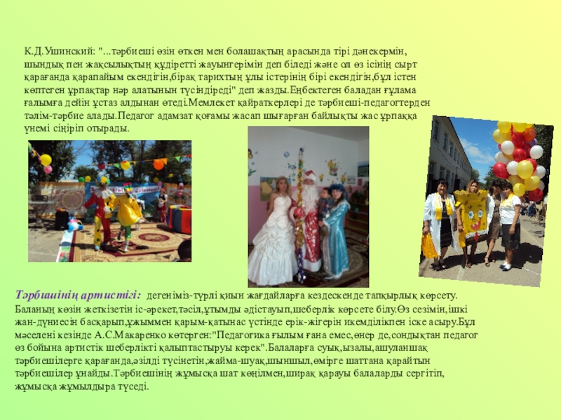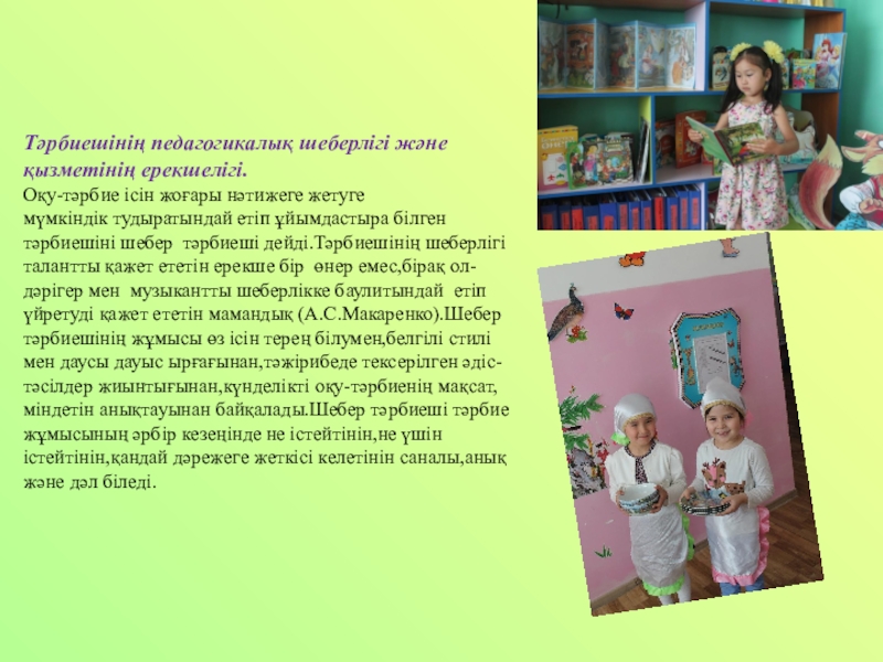 Слайд 14Тәрбиешінің педагогикалық шеберлігі және қызметінің ерекшелігі.