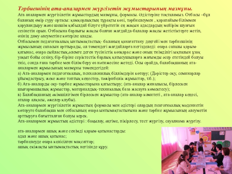 Ата аналармен жүргізілетін жұмыстардың мазмұны, формасы. Әдістеріне