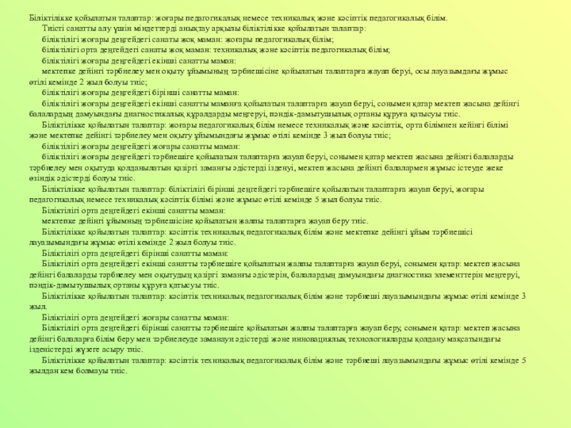 Слайд 5Біліктілікке қойылатын талаптар: жоғары педагогикалық немесе техникалық және кәсіптік педагогикалық білім.