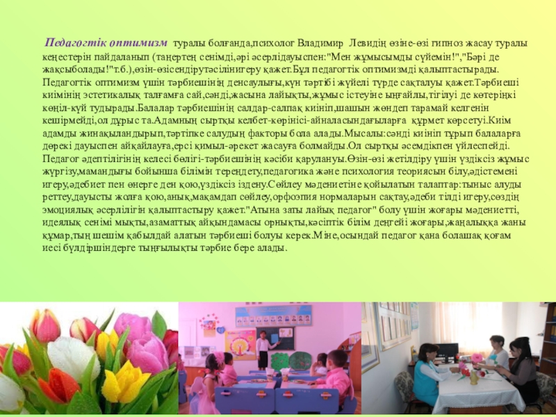 Слайд 8 Педагогтік оптимизм туралы болғанда,психолог Владимир Левидің өзіне-өзі гипноз жасау туралы кеңестерін пайдаланып (таңертең сенімді,әрі