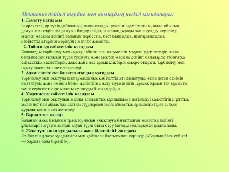 Слайд 15Мектепке дейінгі тәрбие мен оқытудың негізгі қағидалары: