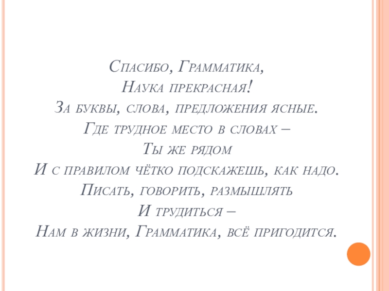 Слайд 30Спасибо, Грамматика, Наука прекрасная! За буквы, слова, предложения ясные. Где трудное место в словах
